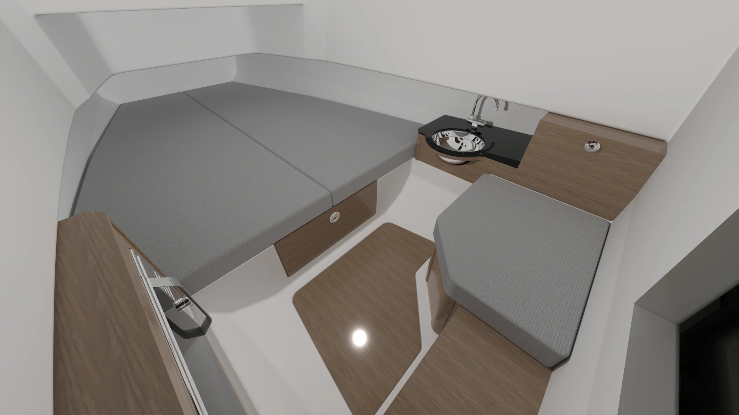 I materassi comfort garantiscono un riposo di qualità, mentre il cassetto sottoletto offre spazio di stivaggio prezioso senza occupare volume utile. La porta scorrevole con serratura assicura privacy e sicurezza. L’illuminazione a LED interni e ambientali crea l’atmosfera giusta in ogni momento, dalla navigazione notturna alla cena a bordo.